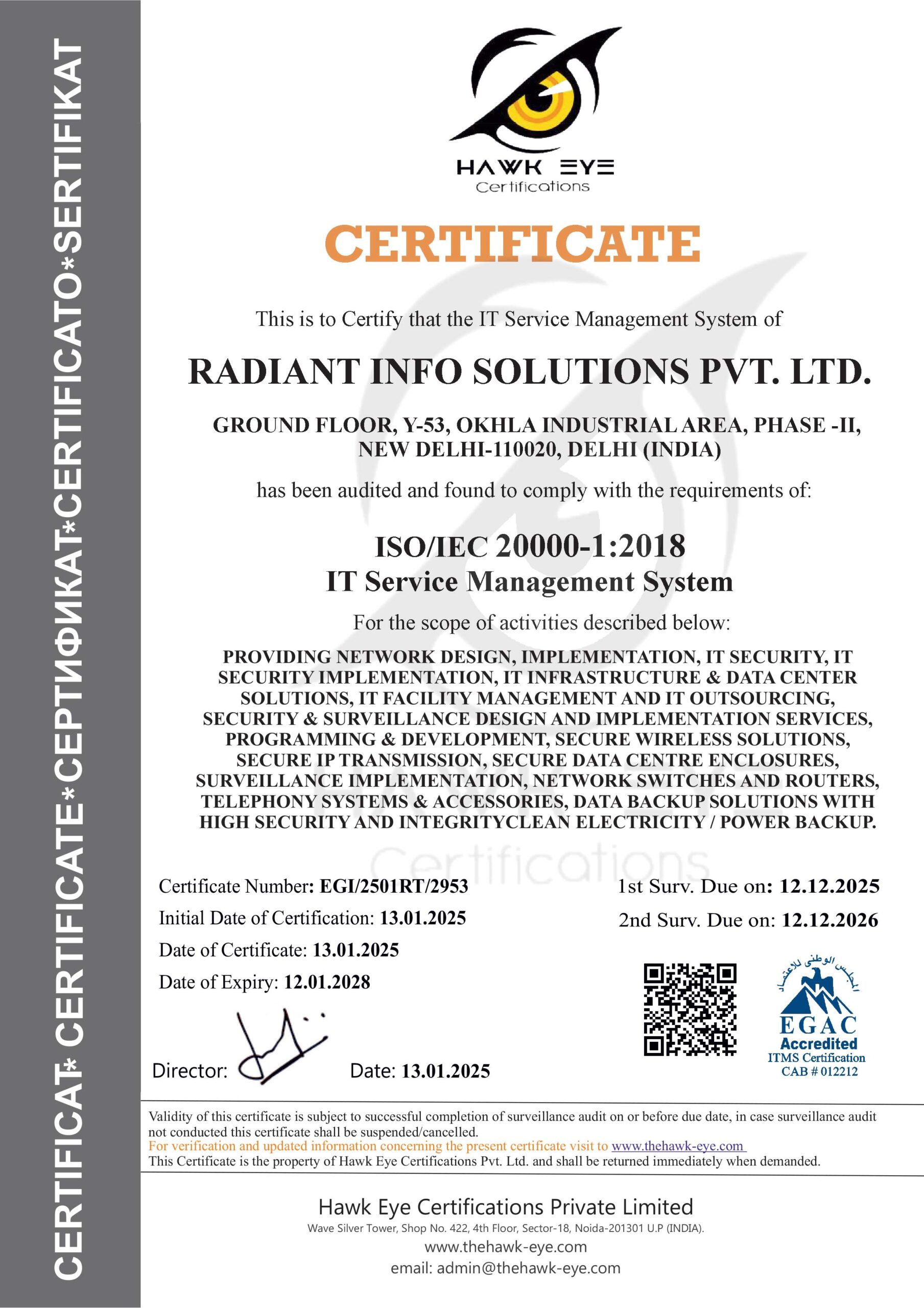 Radiant Info Solutions Pvt. Ltd. is an ISO 9001:2015 a certified organization that emphasizes delivering performance to Radiant as an organization. We spell quality for Network Infrastructure Installation, Integration, and Management. Our promise of superior quality in the same comes from an experience of more than 200,000 connects and more than 70 satisfied clients.
