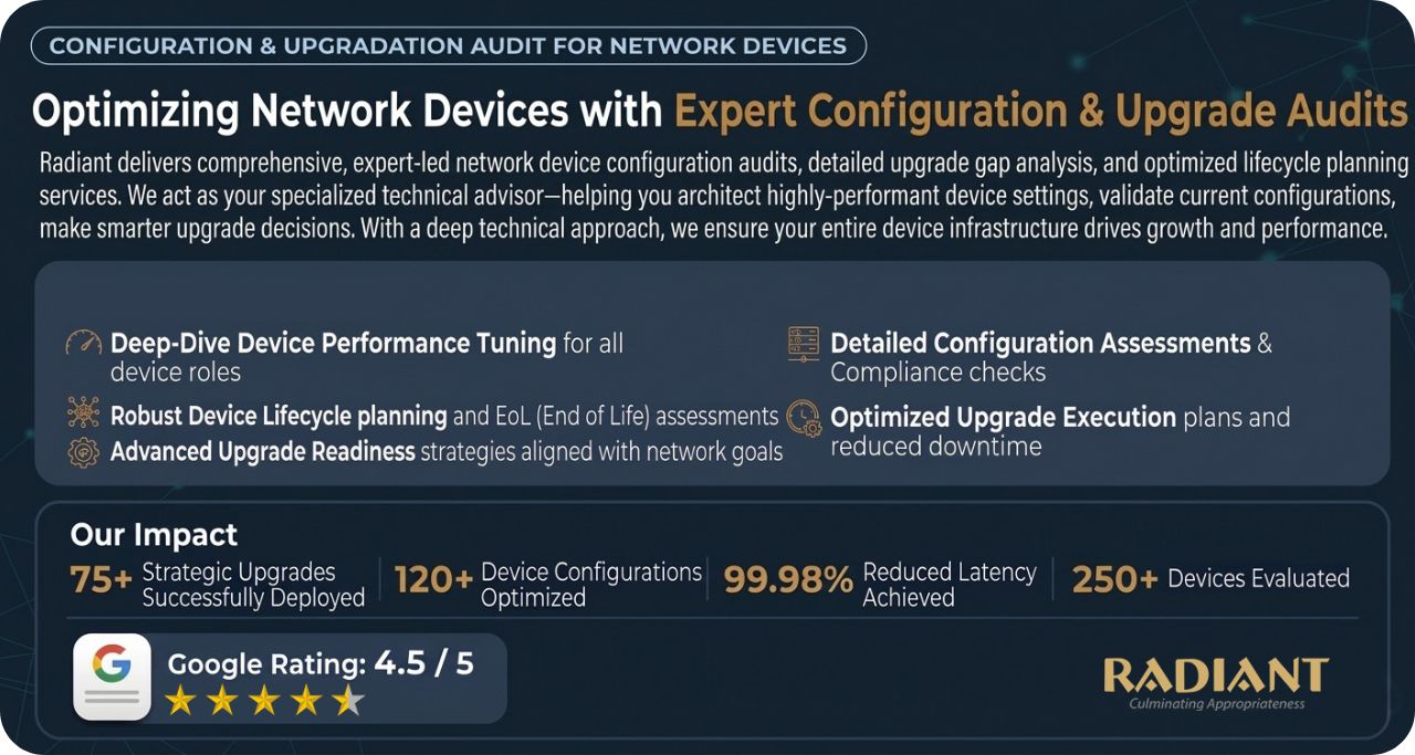 At Radiant Info Solutions, our configuration audit services are designed to ensure your network devices operate securely, efficiently, and in alignment with best practices. Our comprehensive approach includes the following key activities: